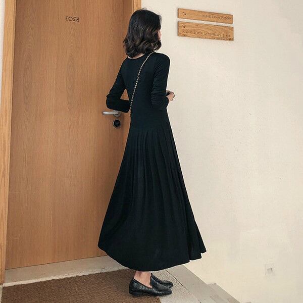 ■深めVネックにライン配色がオシャレなニットベストとシンプルなロングワンピのお得なセット■