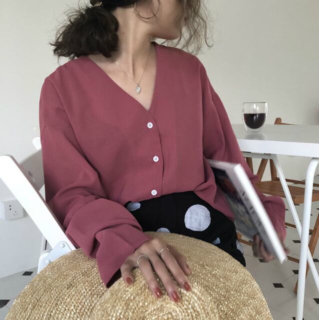 Vネックのノーカラーで顔周りがすっきりと見える、無地のシンプルブラウスです♪
