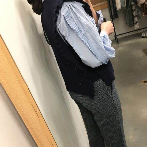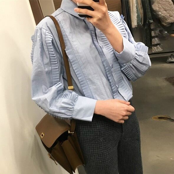 ●○プリーツ風のフリルがレトロ可愛い!爽やか襟付きブラウス○●