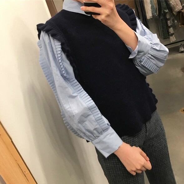 袖とフロント部分のプリーツ風フリルが目を引くレトロな印象のブラウス!
