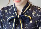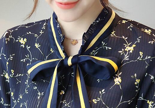 ●○ネイビー×イエローのバイカラーが華やか!ガーリーボウタイブラウス○●