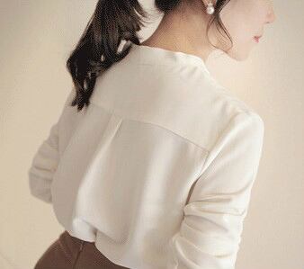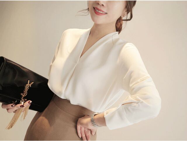 ノーカラーのVネックラインがデコルテをきれいに見せてくれる女性らしいブラウス♪