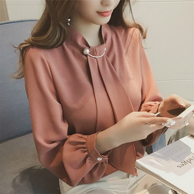 首もとのパールアクセサリーが上品な雰囲気のベーシックなブラウスです♪