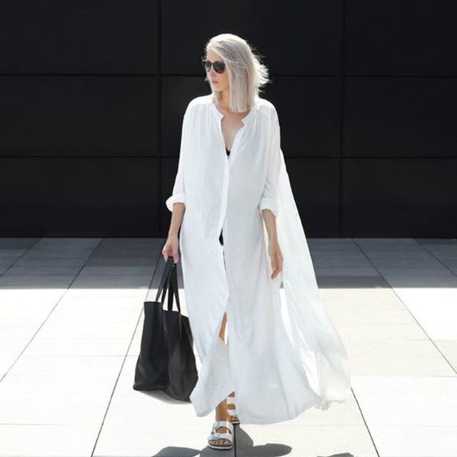 マオカラーとタックを効かせたシンプルなデザインのロングワンピース