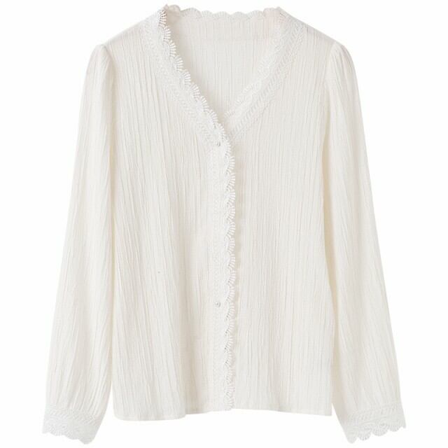 袖とフロント部分にたっぷりレースをあしらったフェミニンブラウス。