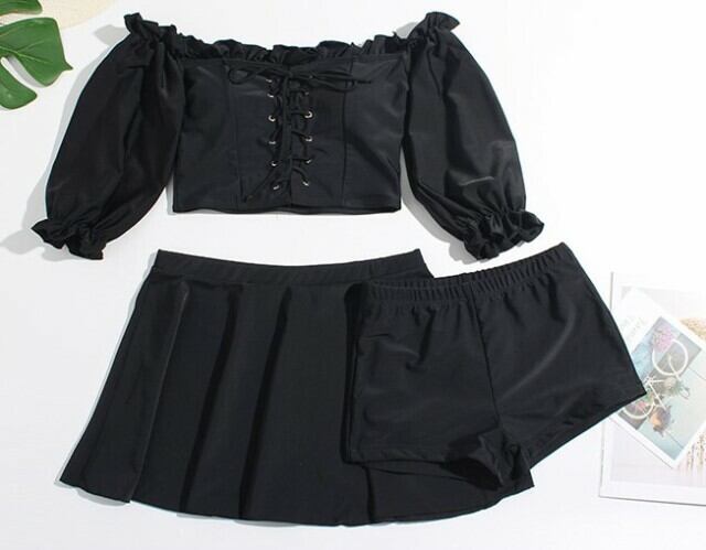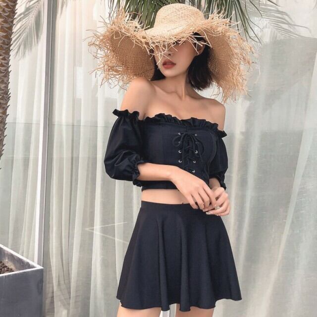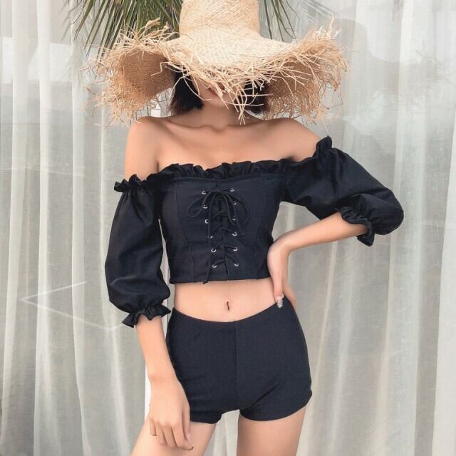 水着 ビキニ 3点セット スカート付き オフショルダー レースアップ セクシー 体型カバー 二の腕カバー 2way 3way フリル ガーリー 洋服感覚 ショートパンツ ビスチェ風 大人かわいい 肩だし アースカラー | seriep
