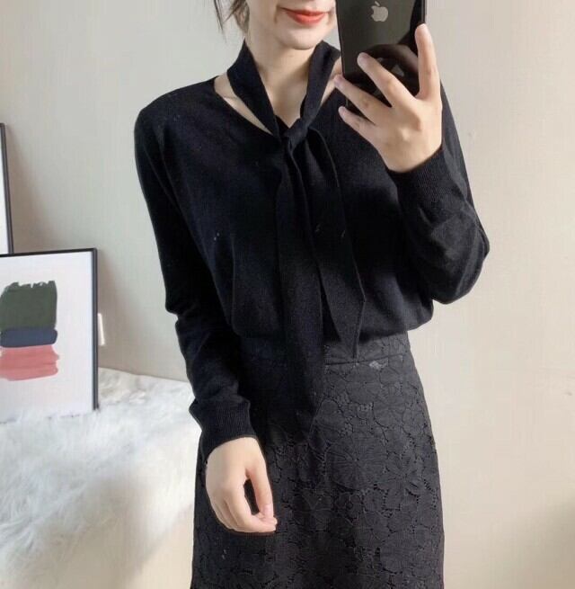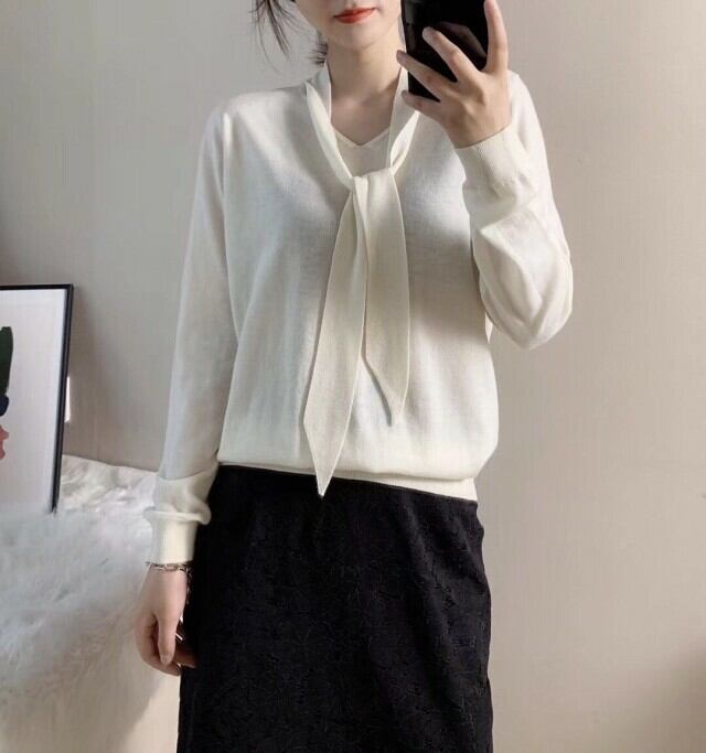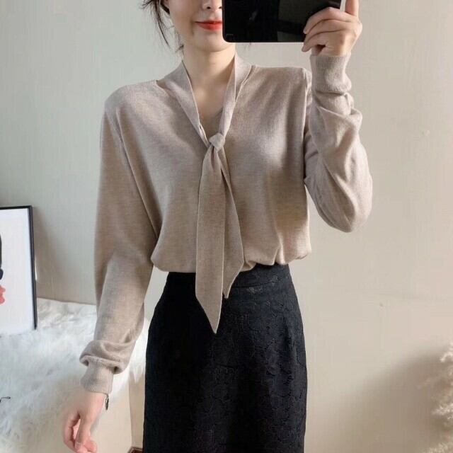 ボウタイニットブラウス 無地 ボウタイ とろみ 大きいサイズ Vネック スモーキー スモーキートーン くすみ ちょいくすみ くすみカラー ミルクチョコレート カプチーノカラー ラテカラー サフランイエロー モノトーン 秋 オフィス カジュアル シンプル | seriep
